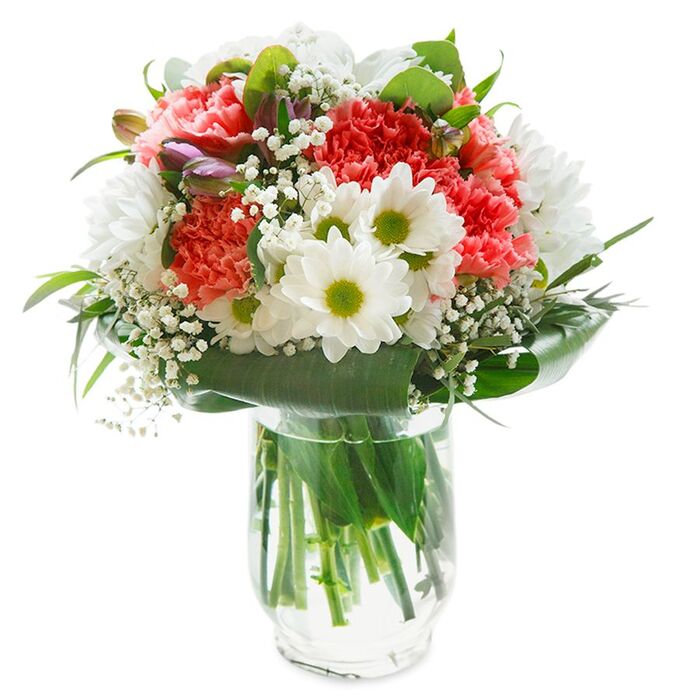 Enhance any occasion with our delicate floral arrangement, a perfect blend of elegance and charm. This stunning bouquet features a harmonious mix of snow-white chrysanthemums, airy gypsophila, soft light pink carnations, and lush aspidistra leaves, artfully arranged to create a visually pleasing display.
